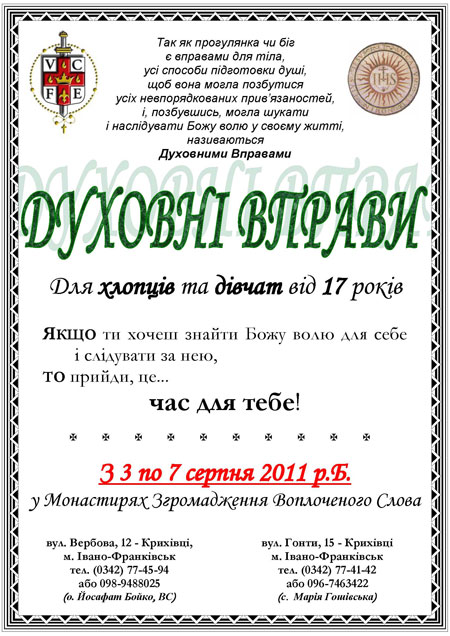 «Блаженний Папа Іван Павло ІІ» – саме так називався дитячий табір, який відбувався з 23 по 30 червня, організований Чернечою Родиною Воплоченого Слова, і проходив у мальовничому селі Люча Косівського району Івано-Франківської області. Отці та сестри віддавалися цілковито для приготування і проведення такого цінного літнього заходу.Близько100 учасників відправилися від Храму Різдва Христового при єпископській резиденції до села Люча на Косівщині.